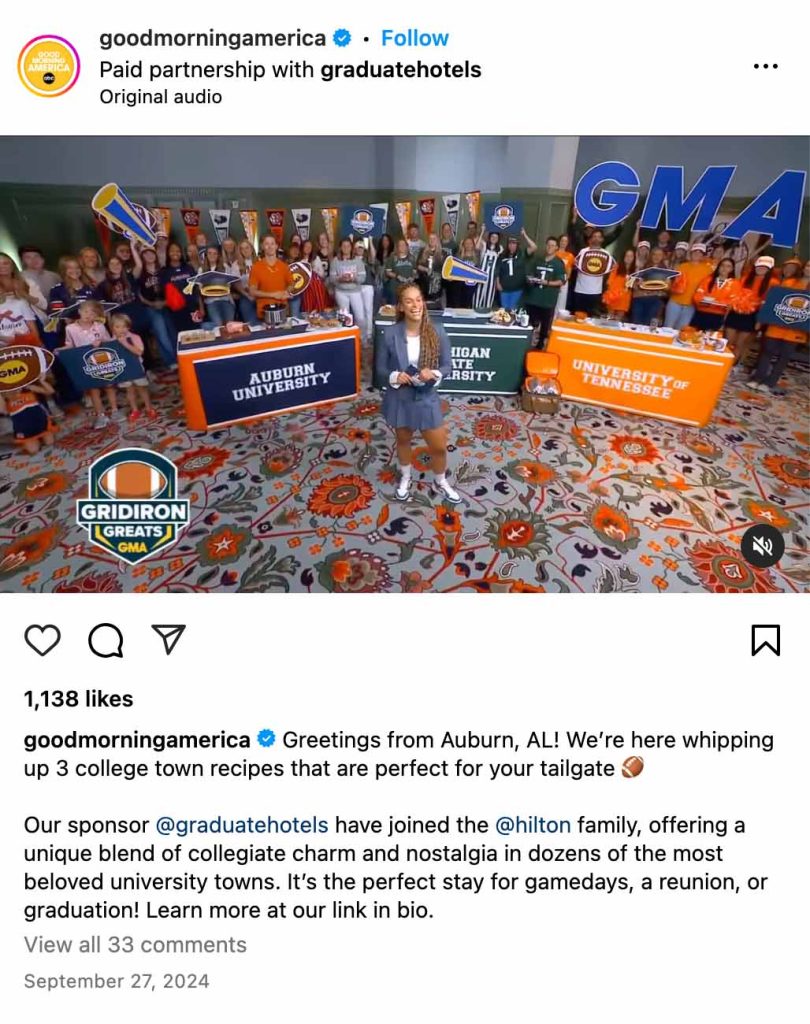 Graduate by Hilton partnered with America’s #1 Morning Show for a custom integration celebrating Graduate Hotels joining the Hilton family. The on-air segment featured an interview with Kevin Osterhaus, President of Hilton’s Global Lifestyle Brands, as well as a LIVE cooking demo at the new Graduate Auburn, with Culinary Director Stephan Bogardus sharing tailgate bites from select Graduate locations. The segment was also posted to GMA’s site and boosted across GMA’s social handles, showcasing Graduate by Hilton as the perfect destination for students and families alike!