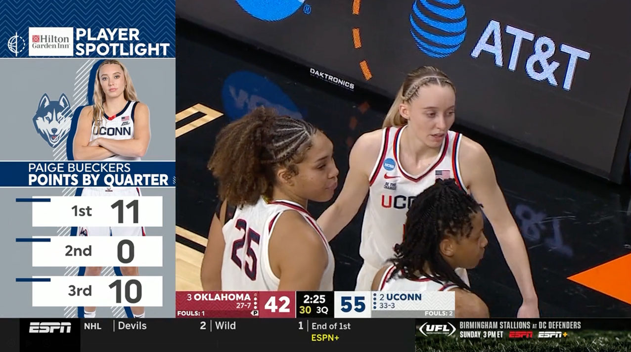 Hilton partnered with ESPN for a per-round feature strip in Women’s College Basketball Sweet 16 round with a “Player Spotlight” feature in each game of the round. Player spotlight dives into a players individual story or statistics that set them apart from the competition. Hilton has been all in for women’s sports, and this partnership shows Hilton’s commitment to the growing fanbase.